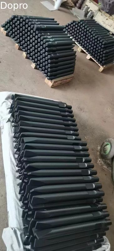 A extremidade de trabalho do cinzel do rompedor de escavadeira é equipada com uma ponta de aço endurecido, também conhecida como ponta da ferramenta ou ponta de cinzel. Essa ponta é responsável por fornecer força de impacto para romper materiais resistentes, como concreto, rocha ou asfalto.